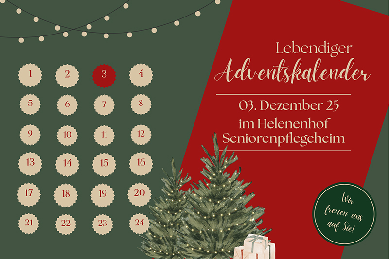 Im Rahmen des lebendigen Adventskalenders laden wir Sie am 03.12.25 zu uns in das Helenenhof Seniorenpflegheim ein. Von 15:00 bis 16:00 Uhr findet in unserem Speisesaal ein geselliges Beisammensein bei Keksen und Heißgetränken statt. Gemeinsam singen wir Weihnachtslieder und lauschen der Weihnachtsgeschichte.